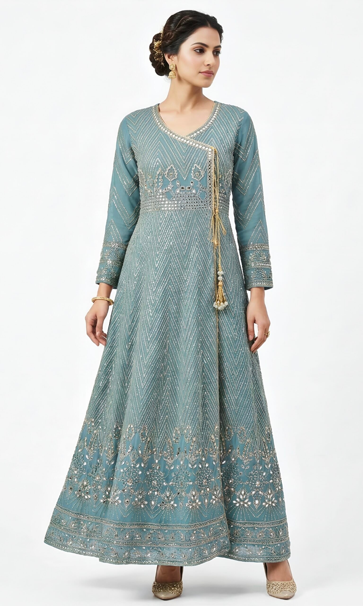 Make an unforgettable entrance in this floor-skimming silhouette. This dress features intricate mirror-work embroidery interspersed with shimmering sequins, designed to catch and reflect light from every angle. Perfect for high-octane evening events where you want to shine with a sophisticated, artisanal glow.