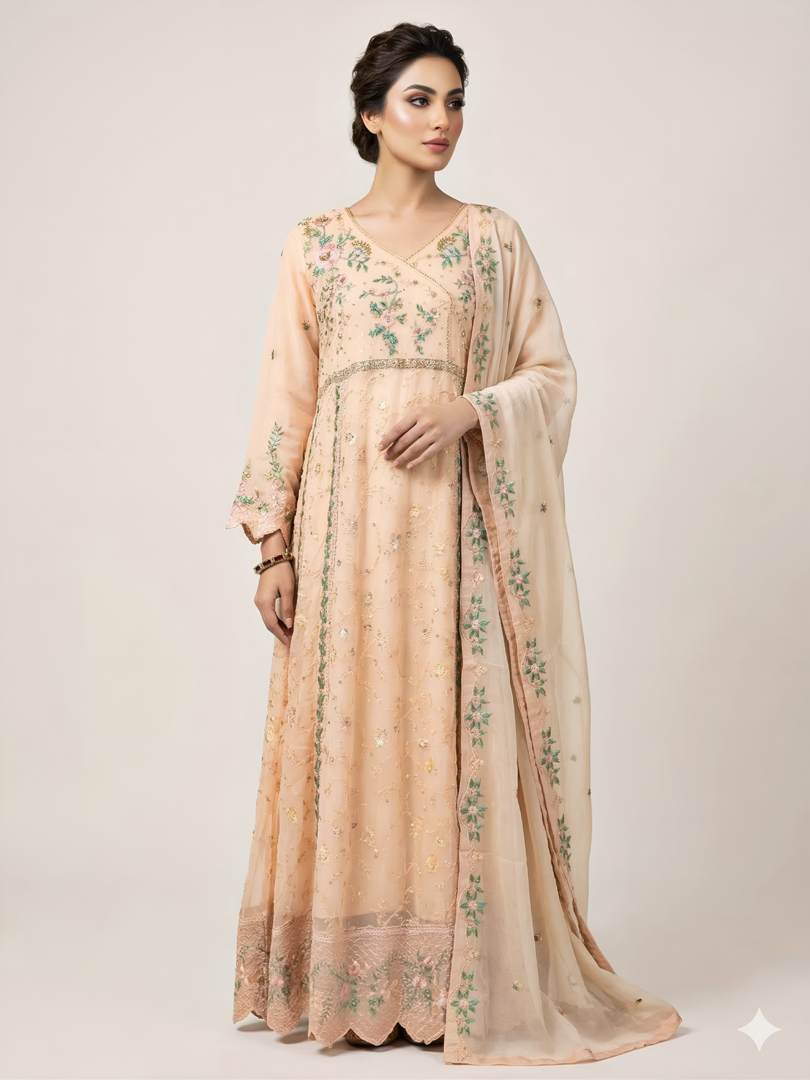 | Elevate your festive wardrobe with this breathtaking three-piece ensemble. Crafted from premium, lightweight chiffon, this gown combines traditional craftsmanship with a modern silhouette, making it an ideal choice for weddings, formal parties, and festive celebration. |