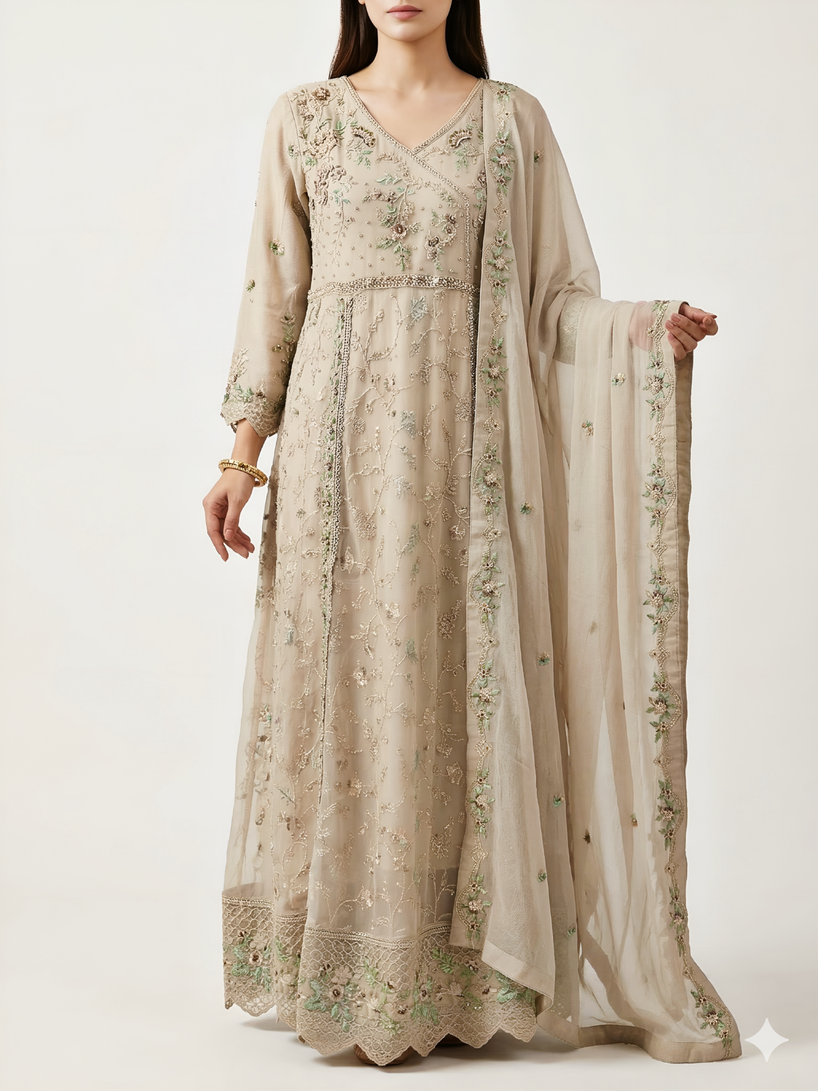 | Elevate your festive wardrobe with this breathtaking three-piece ensemble. Crafted from premium, lightweight chiffon, this gown combines traditional craftsmanship with a modern silhouette, making it an ideal choice for weddings, formal parties, and festive celebration. |