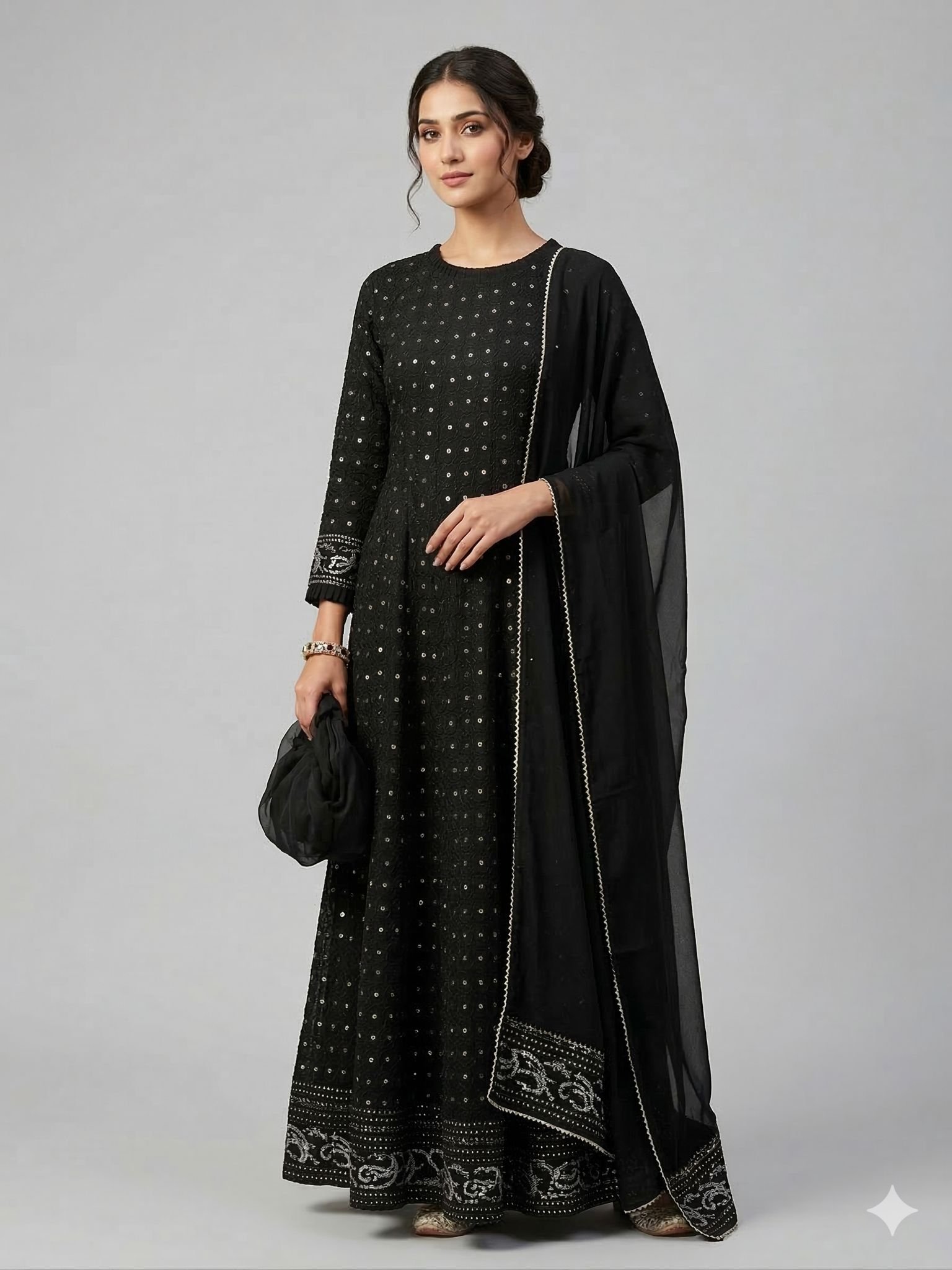 | Elevate your festive wardrobe with this breathtaking three-piece ensemble. Crafted from premium, lightweight chiffon, this gown combines traditional craftsmanship with a modern silhouette, making it an ideal choice for weddings, formal parties, and festive celebration. |