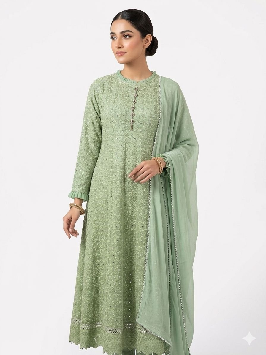 | Elevate your festive wardrobe with this breathtaking three-piece ensemble. Crafted from premium, lightweight chiffon, this gown combines traditional craftsmanship with a modern silhouette, making it an ideal choice for weddings, formal parties, and festive celebration. |