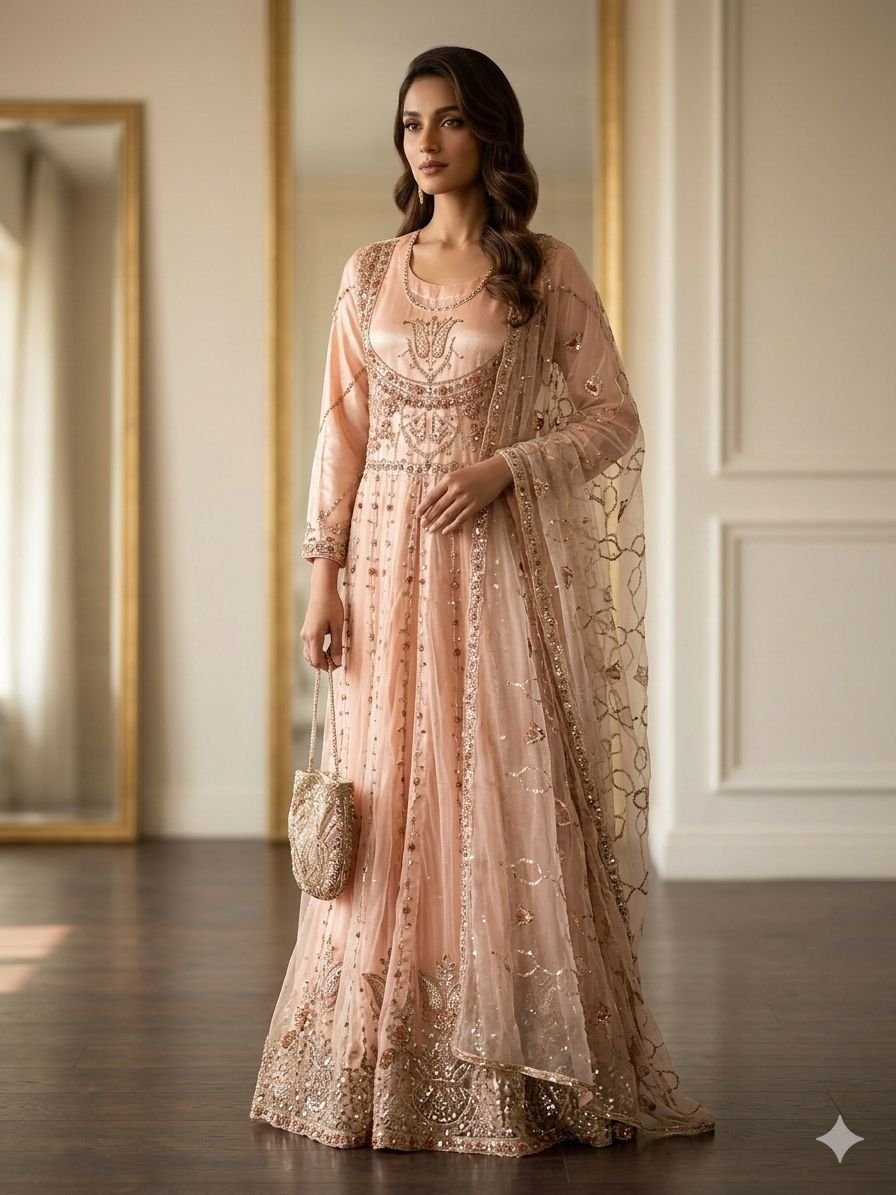 | Elevate your festive wardrobe with this breathtaking three-piece ensemble. Crafted from premium, lightweight chiffon, this gown combines traditional craftsmanship with a modern silhouette, making it an ideal choice for weddings, formal parties, and festive celebration. |