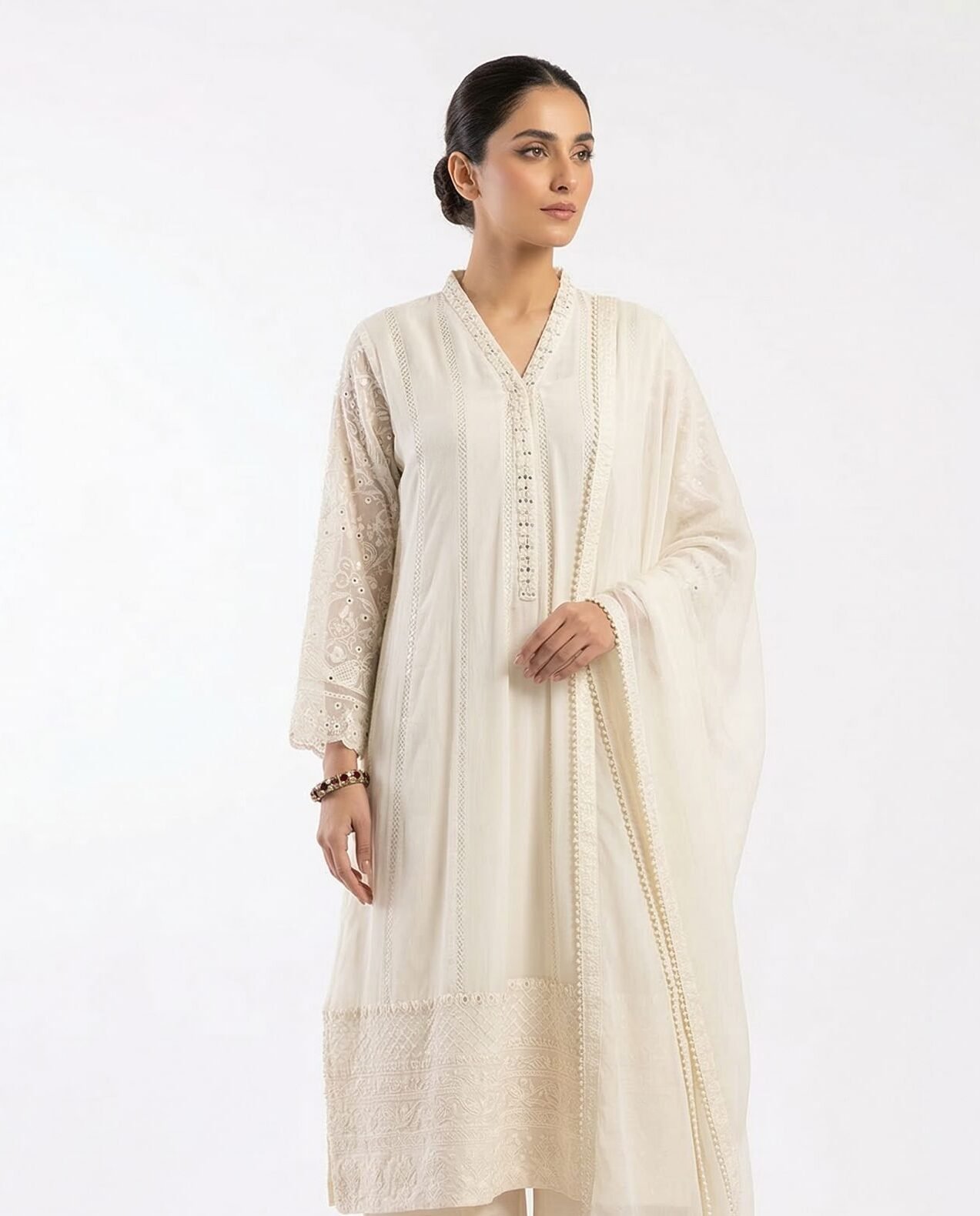 | Elevate your festive wardrobe with this breathtaking three-piece ensemble. Crafted from premium, lightweight chiffon, this gown combines traditional craftsmanship with a modern silhouette, making it an ideal choice for weddings, formal parties, and festive celebration. |