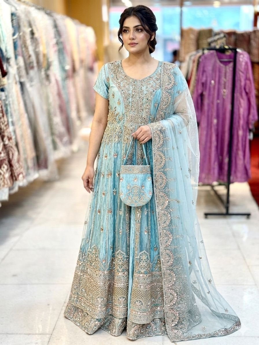 Elevate your festive wardrobe with this breathtaking three-piece ensemble. Crafted from premium, lightweight chiffon, this gown combines traditional craftsmanship with a modern silhouette, making it an ideal choice for weddings, formal parties, and festive celebration.