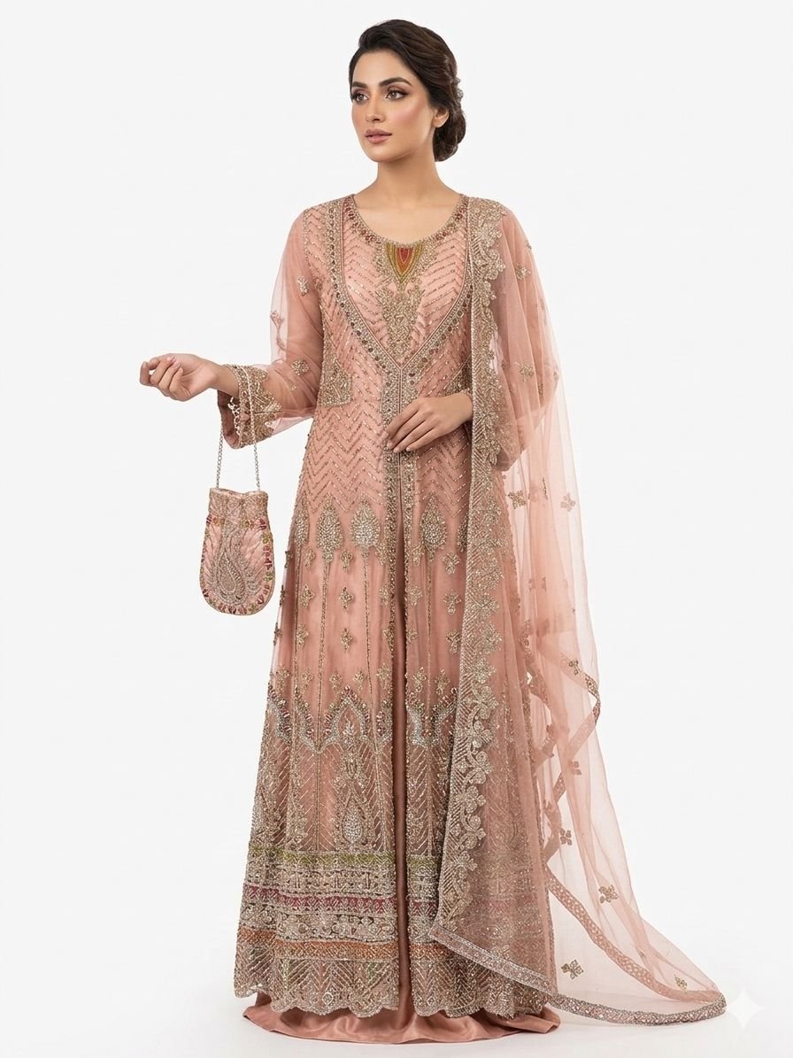 | Elevate your festive wardrobe with this breathtaking three-piece ensemble. Crafted from premium, lightweight chiffon, this gown combines traditional craftsmanship with a modern silhouette, making it an ideal choice for weddings, formal parties, and festive celebration. |