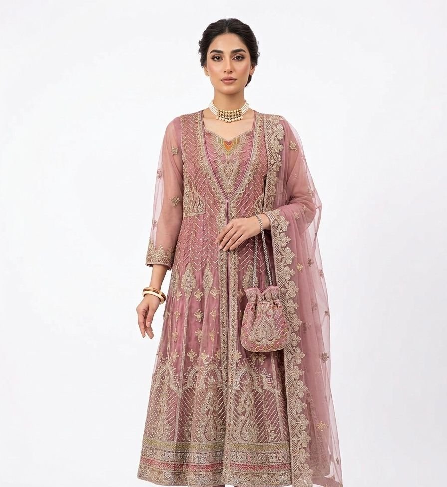 Elevate your festive wardrobe with this breathtaking three-piece ensemble. Crafted from premium, lightweight chiffon, this gown combines traditional craftsmanship with a modern silhouette, making it an ideal choice for weddings, formal parties, and festive celebration.