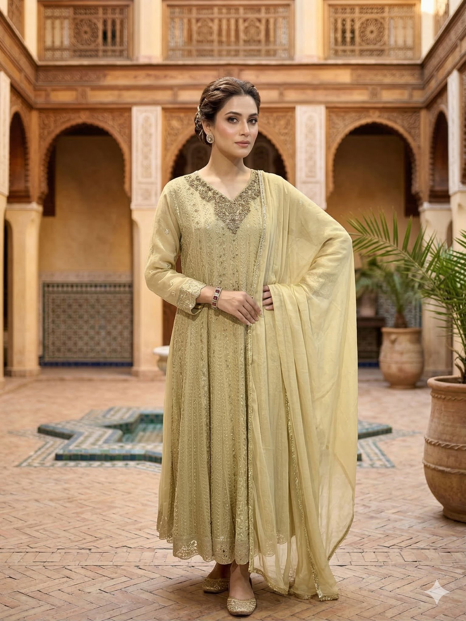 Elevate your festive wardrobe with this breathtaking three-piece ensemble. Crafted from premium, lightweight chiffon, this gown combines traditional craftsmanship with a modern silhouette, making it an ideal choice for weddings, formal parties, and festive celebration.