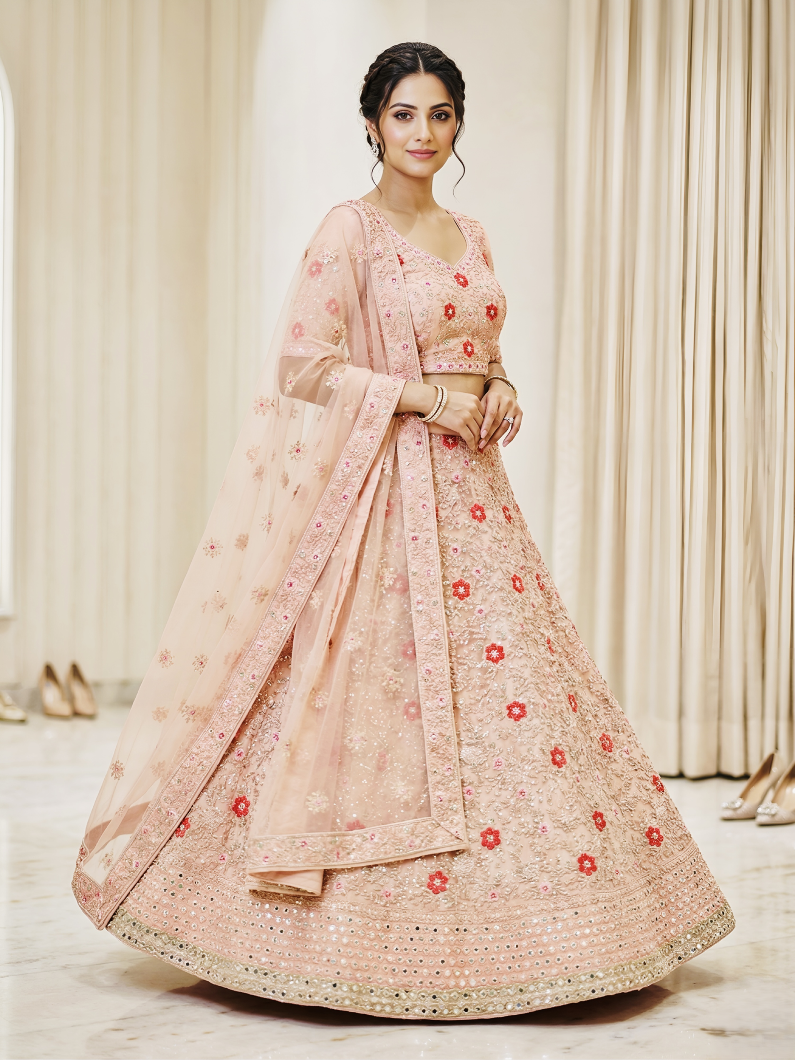 “Understated luxury at its finest. With a focus on clean lines, rich jewel tones, and a sophisticated sheen, this lehenga redefines festive wear. A versatile silhouette that lets your natural radiance take center stage.”