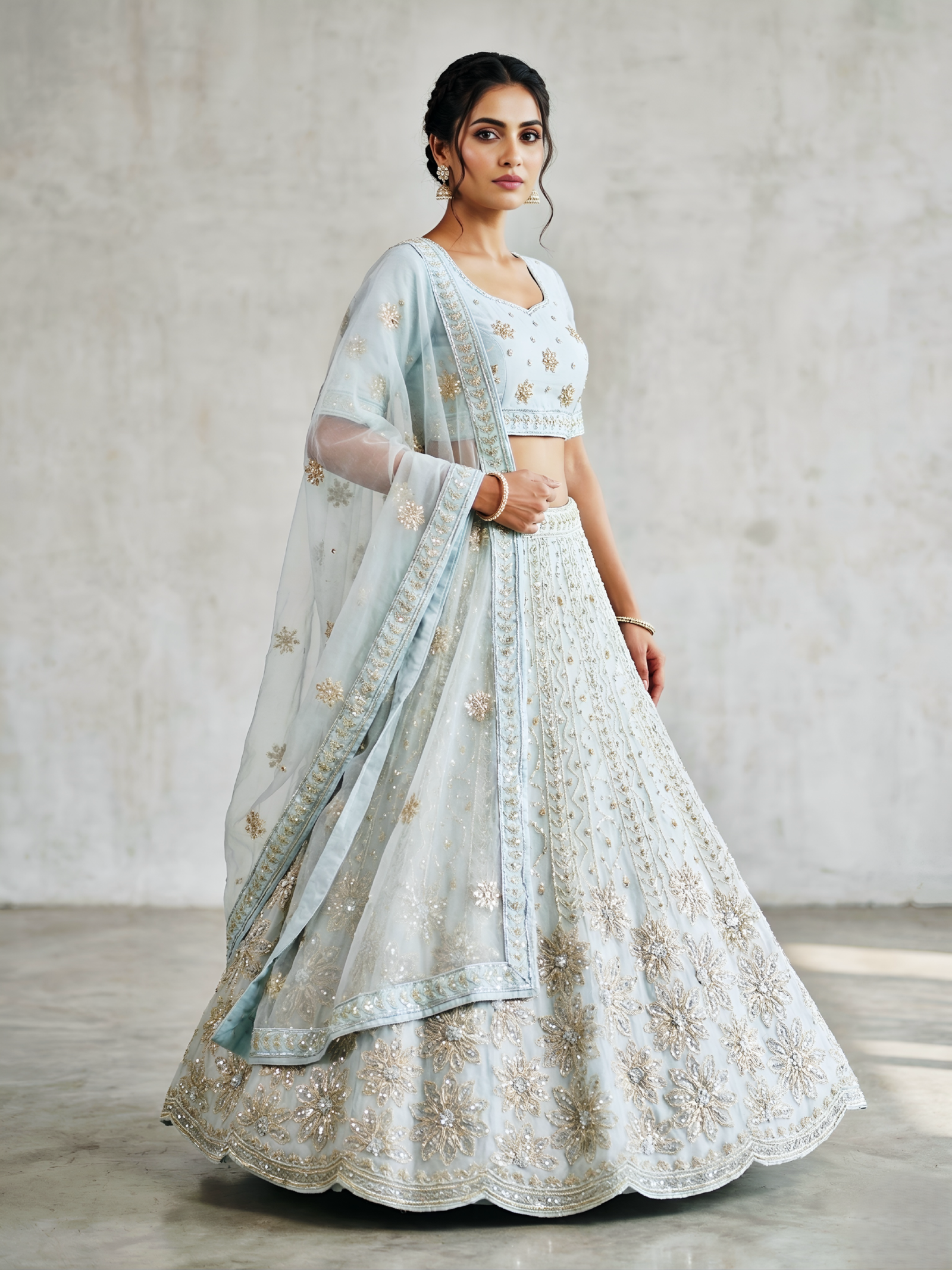 “Understated luxury at its finest. With a focus on clean lines, rich jewel tones, and a sophisticated sheen, this lehenga redefines festive wear. A versatile silhouette that lets your natural radiance take center stage.”