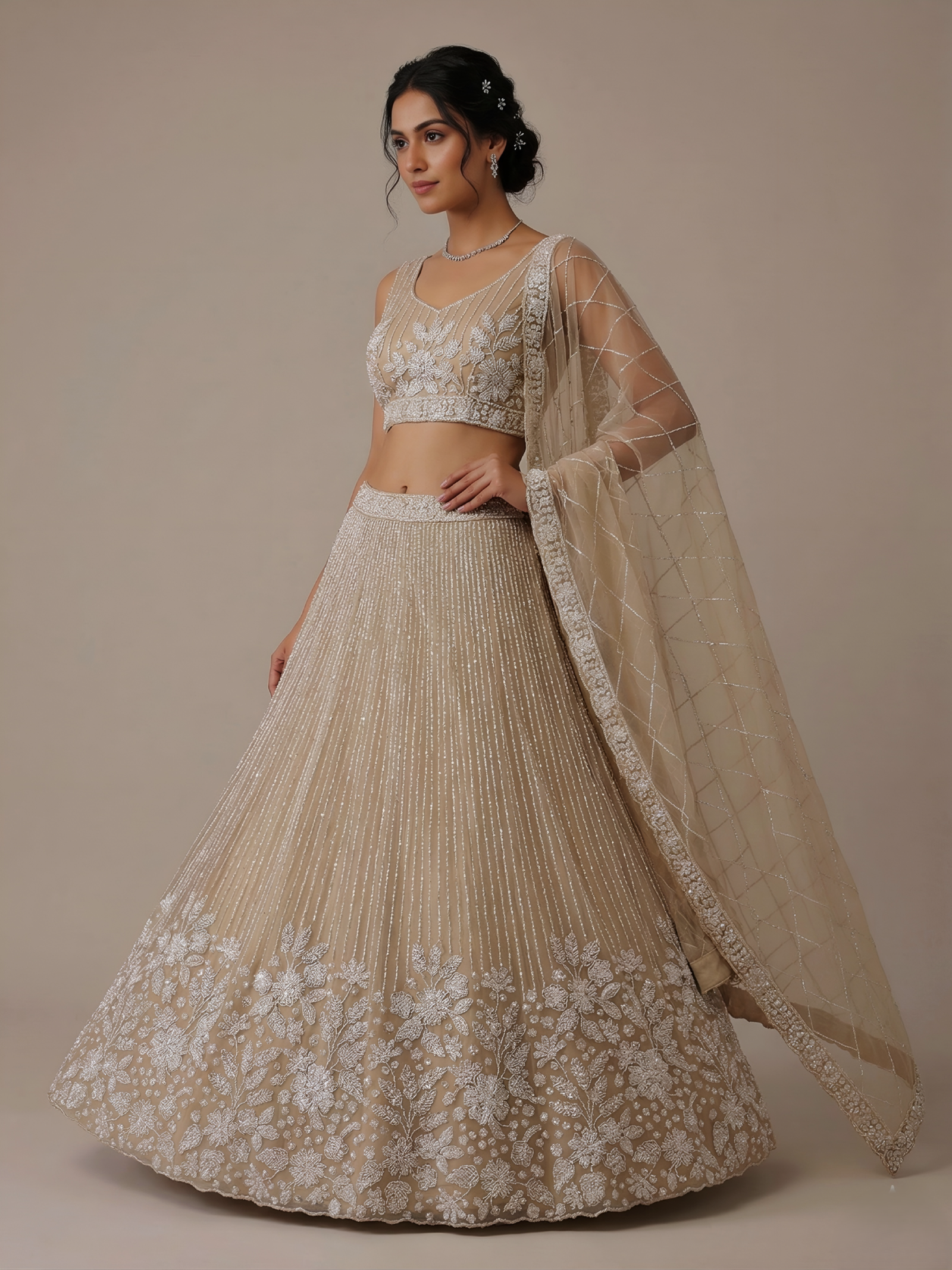 “Understated luxury at its finest. With a focus on clean lines, rich jewel tones, and a sophisticated sheen, this lehenga redefines festive wear. A versatile silhouette that lets your natural radiance take center stage.”
