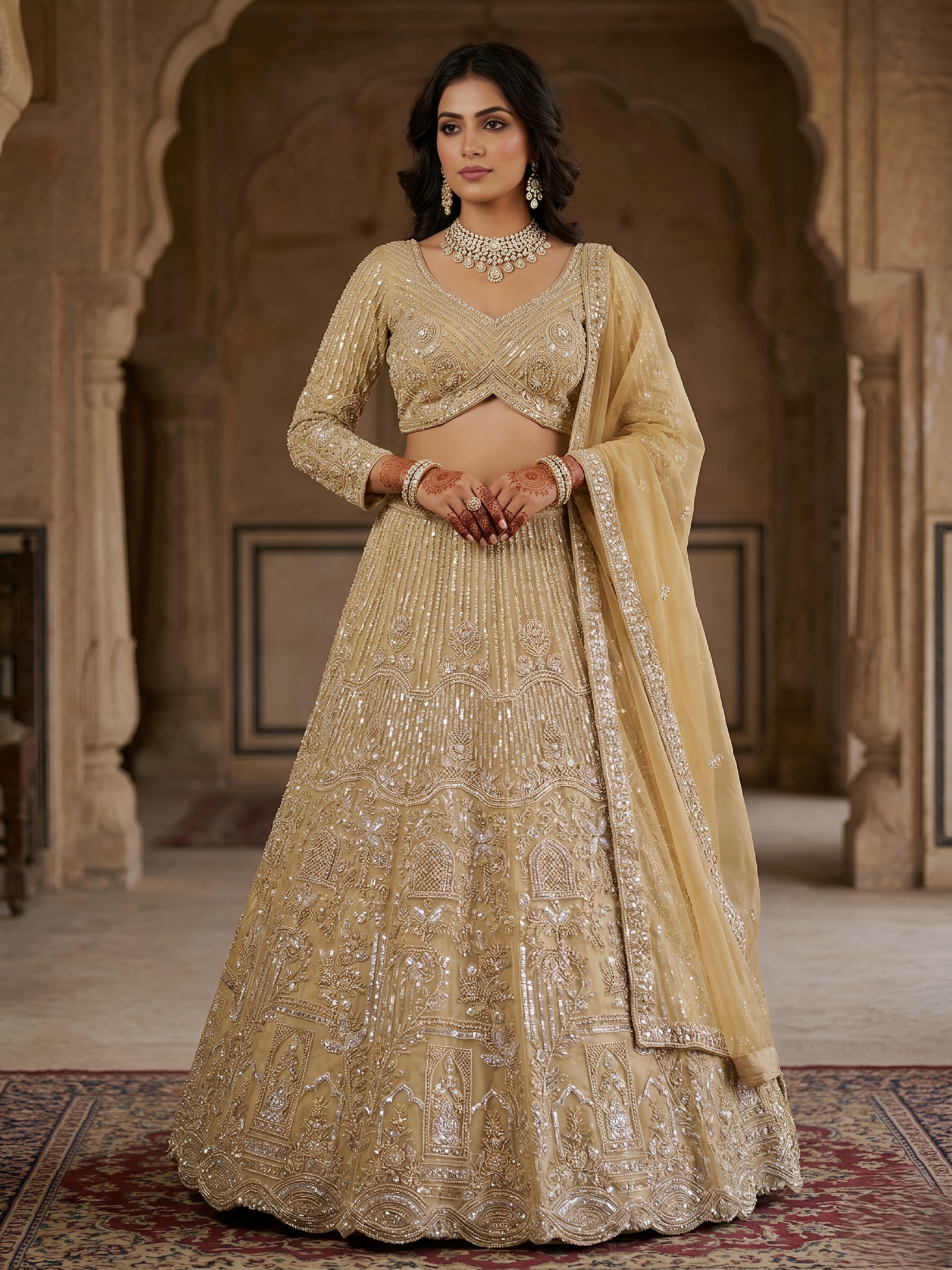 “Understated luxury at its finest. With a focus on clean lines, rich jewel tones, and a sophisticated sheen, this lehenga redefines festive wear. A versatile silhouette that lets your natural radiance take center stage.”