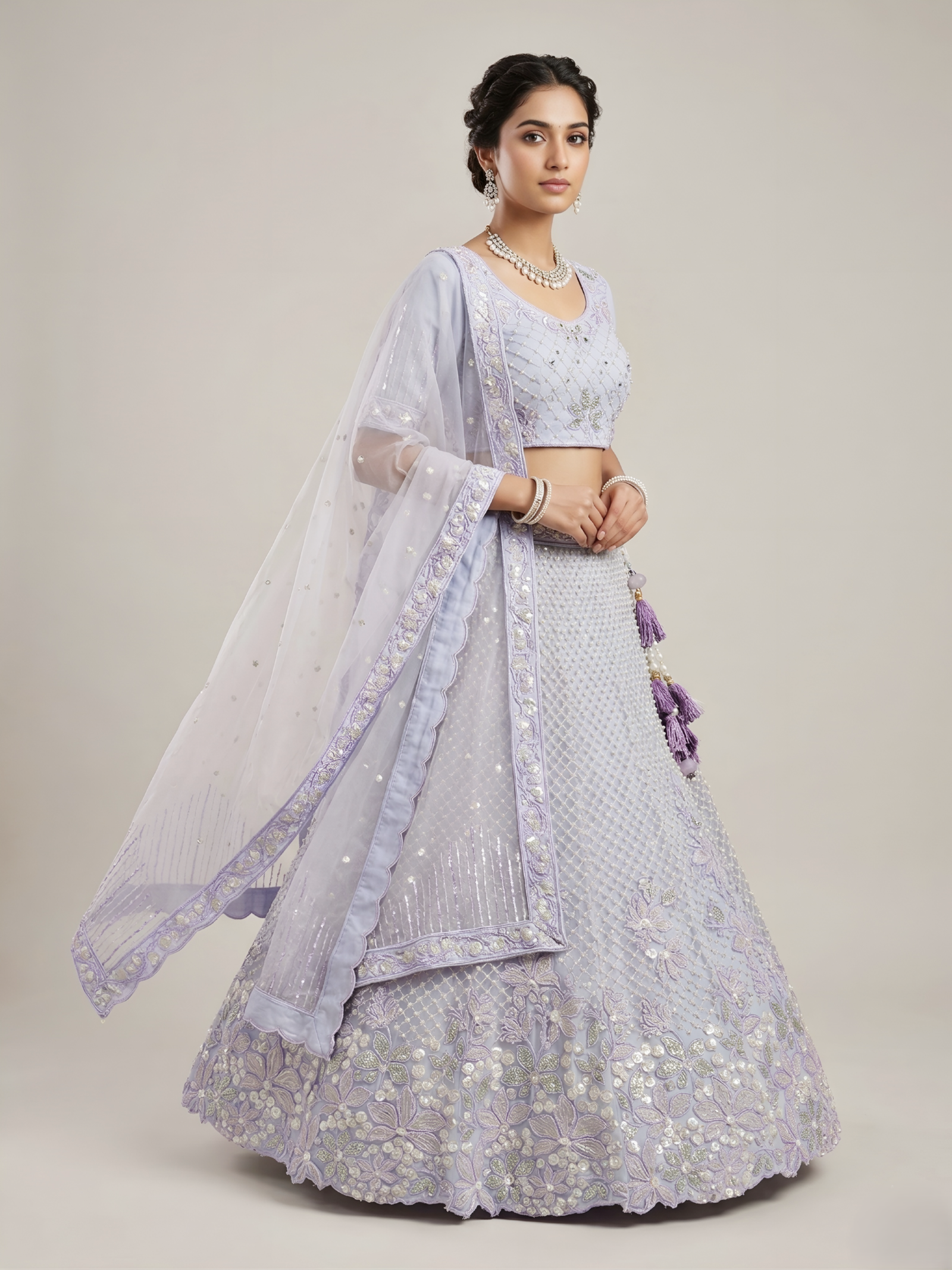 “Understated luxury at its finest. With a focus on clean lines, rich jewel tones, and a sophisticated sheen, this lehenga redefines festive wear. A versatile silhouette that lets your natural radiance take center stage.”