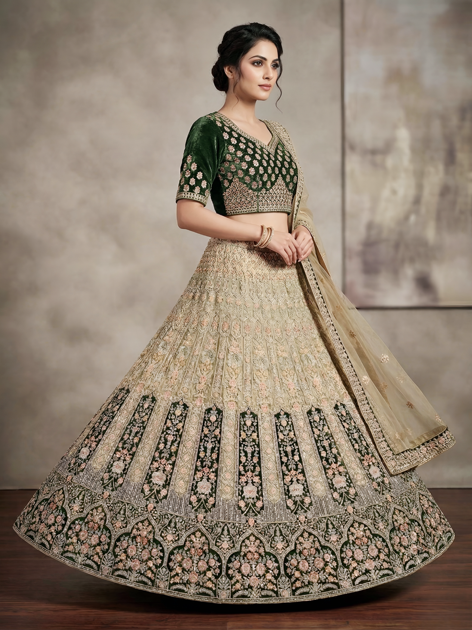 “Understated luxury at its finest. With a focus on clean lines, rich jewel tones, and a sophisticated sheen, this lehenga redefines festive wear. A versatile silhouette that lets your natural radiance take center stage.”
