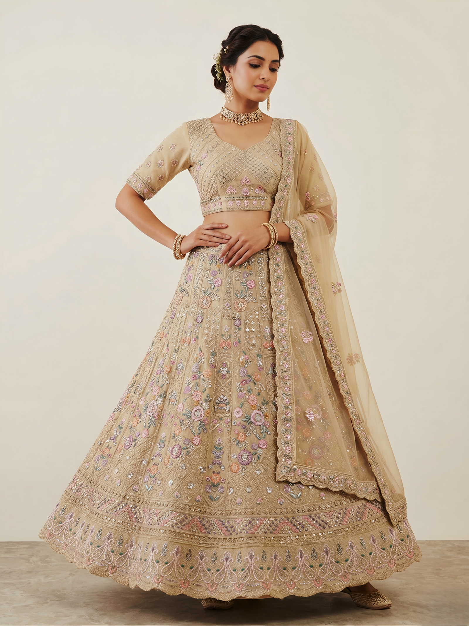 “Understated luxury at its finest. With a focus on clean lines, rich jewel tones, and a sophisticated sheen, this lehenga redefines festive wear. A versatile silhouette that lets your natural radiance take center stage.”