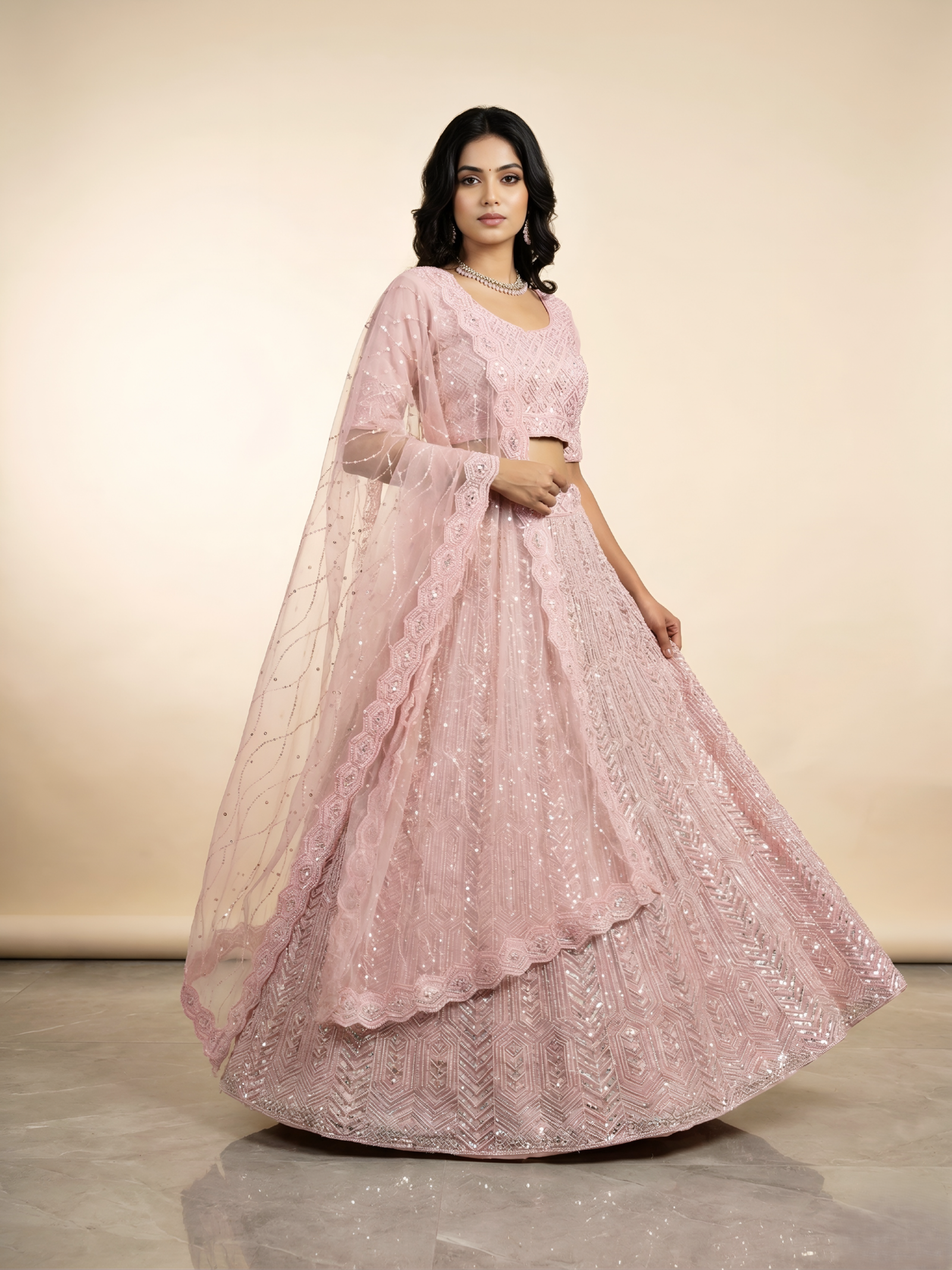 “Understated luxury at its finest. With a focus on clean lines, rich jewel tones, and a sophisticated sheen, this lehenga redefines festive wear. A versatile silhouette that lets your natural radiance take center stage.”