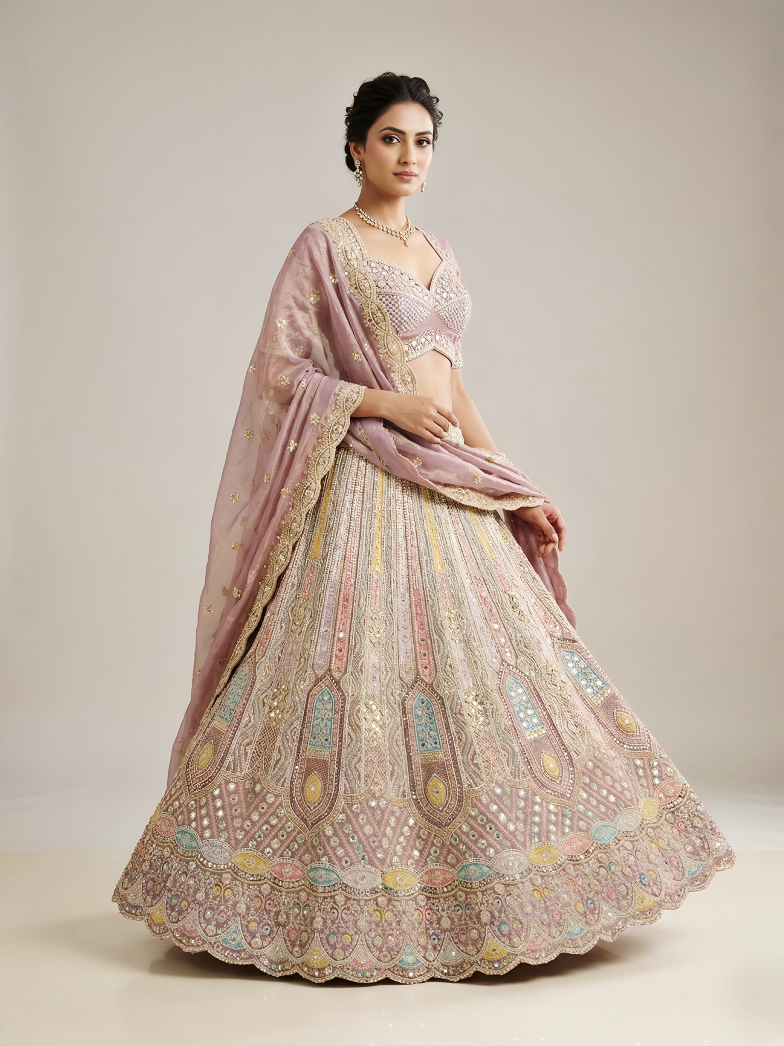 “Understated luxury at its finest. With a focus on clean lines, rich jewel tones, and a sophisticated sheen, this lehenga redefines festive wear. A versatile silhouette that lets your natural radiance take center stage.”