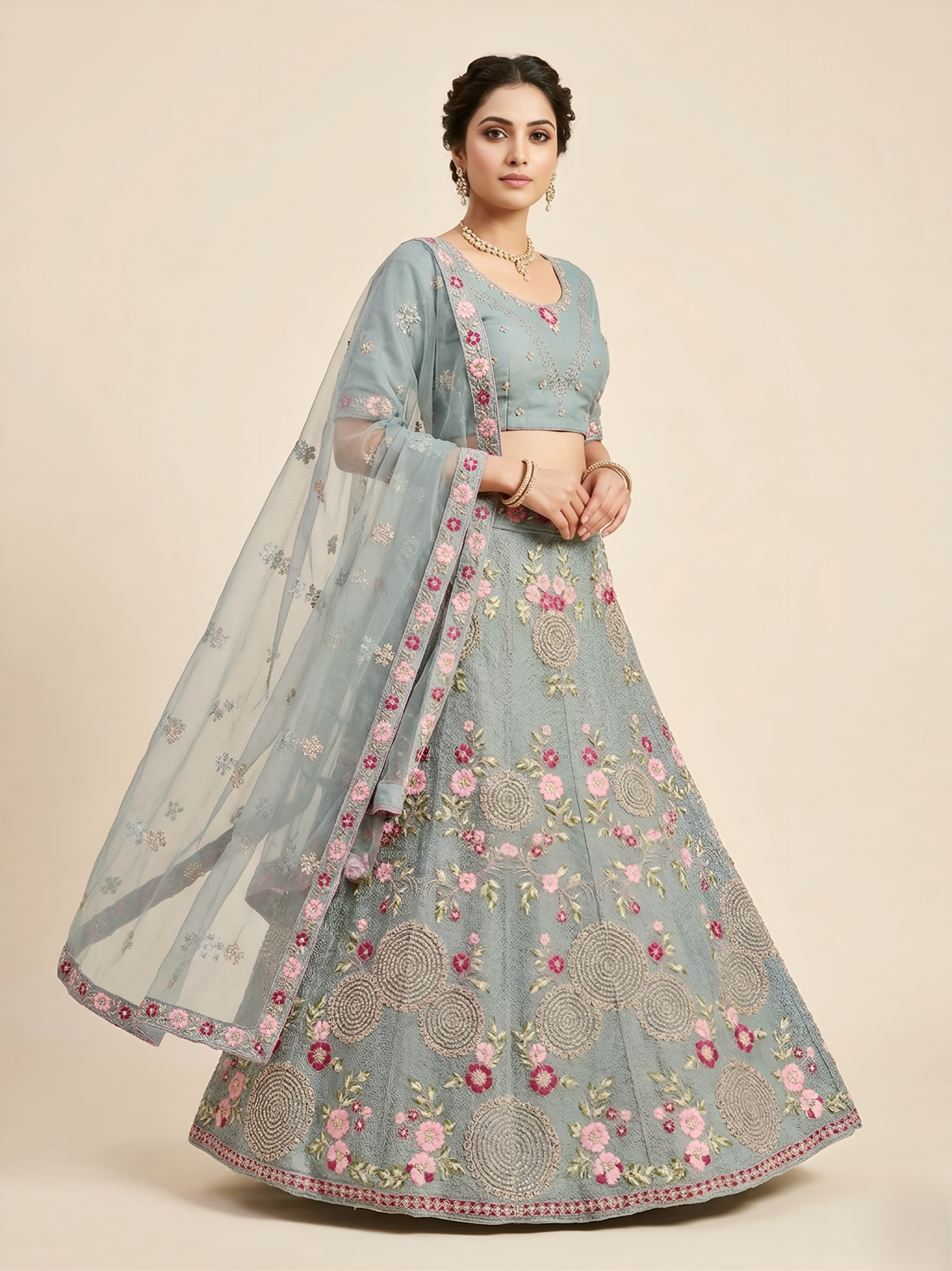 “Understated luxury at its finest. With a focus on clean lines, rich jewel tones, and a sophisticated sheen, this lehenga redefines festive wear. A versatile silhouette that lets your natural radiance take center stage.”