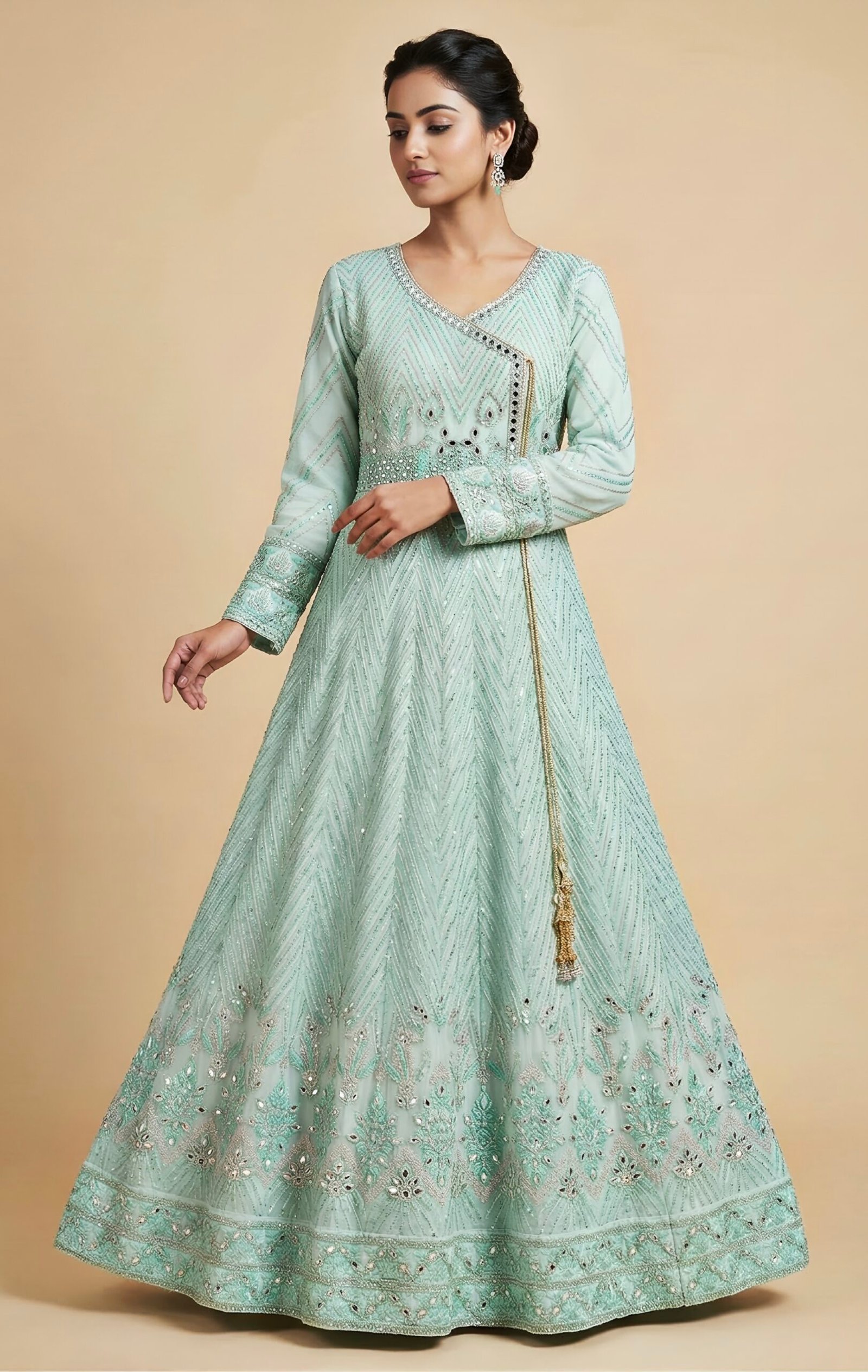 Make an unforgettable entrance in this floor-skimming silhouette. This dress features intricate mirror-work embroidery interspersed with shimmering sequins, designed to catch and reflect light from every angle. Perfect for high-octane evening events where you want to shine with a sophisticated, artisanal glow.